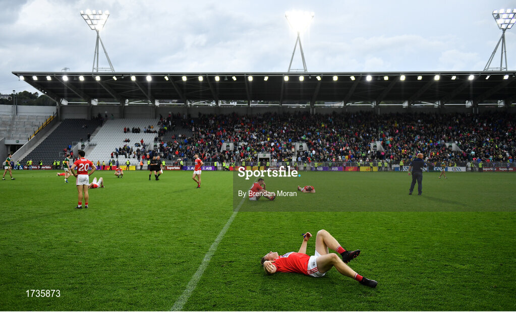 22 June 2019; Cork players, including Liam O’Donovan of Cork, fall to the ground at the final whistle of the Munster GAA Football Senior Championship Final match between Cork and Kerry at Páirc Ui Chaoimh in Cork. Photo by Brendan Moran/Sportsfile
