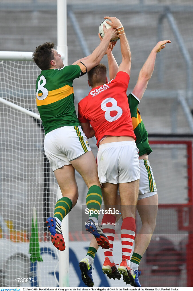 22 June 2019; David Moran of Kerry gets to the ball ahead of Ian Maguire of Cork in the final seconds of the Munster GAA Football Senior Championship Final match between Cork and Kerry at Páirc Ui Chaoimh in Cork. Photo by Brendan Moran/Sportsfile