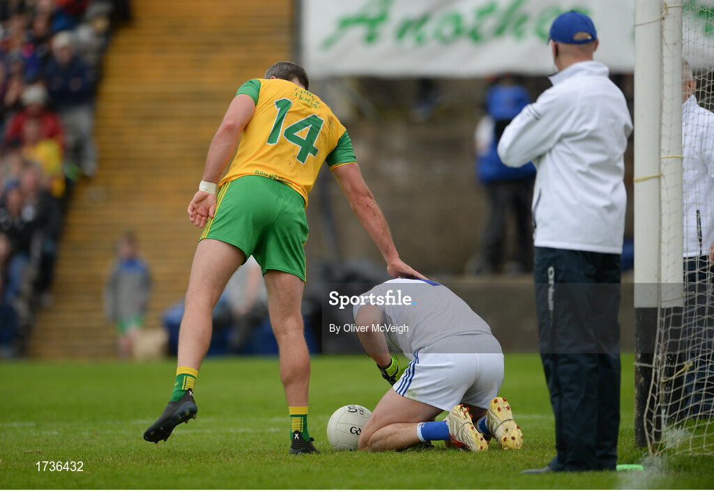 23 June 2019; Michael Murphy of Donegal consoles Raymond Galligan of Cavan after a challenge during the Ulster GAA Football Senior Championship Final match between Donegal and Cavan at St Tiernach's Park in Clones, Monaghan. Photo by Oliver McVeigh/Sportsfile