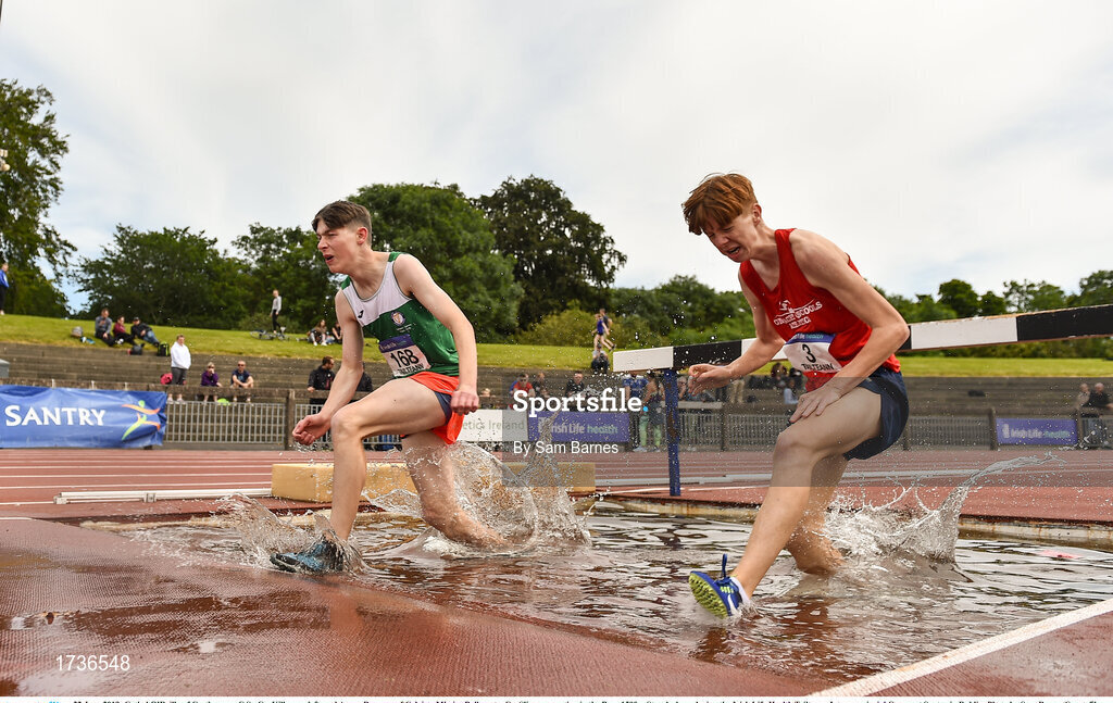 22 June 2019; Cathal O’Reilly of Castlecomer C.S., Co. Kilkenny, left, and Aaron Brennan of Colaiste Mhuire Ballymote, Co. Sligo, competing in the Boys 1500m Steeplechase during the Irish Life Health Tailteann Inter-provincial Games at Santry in Dublin. Photo by Sam Barnes/Sportsfile
