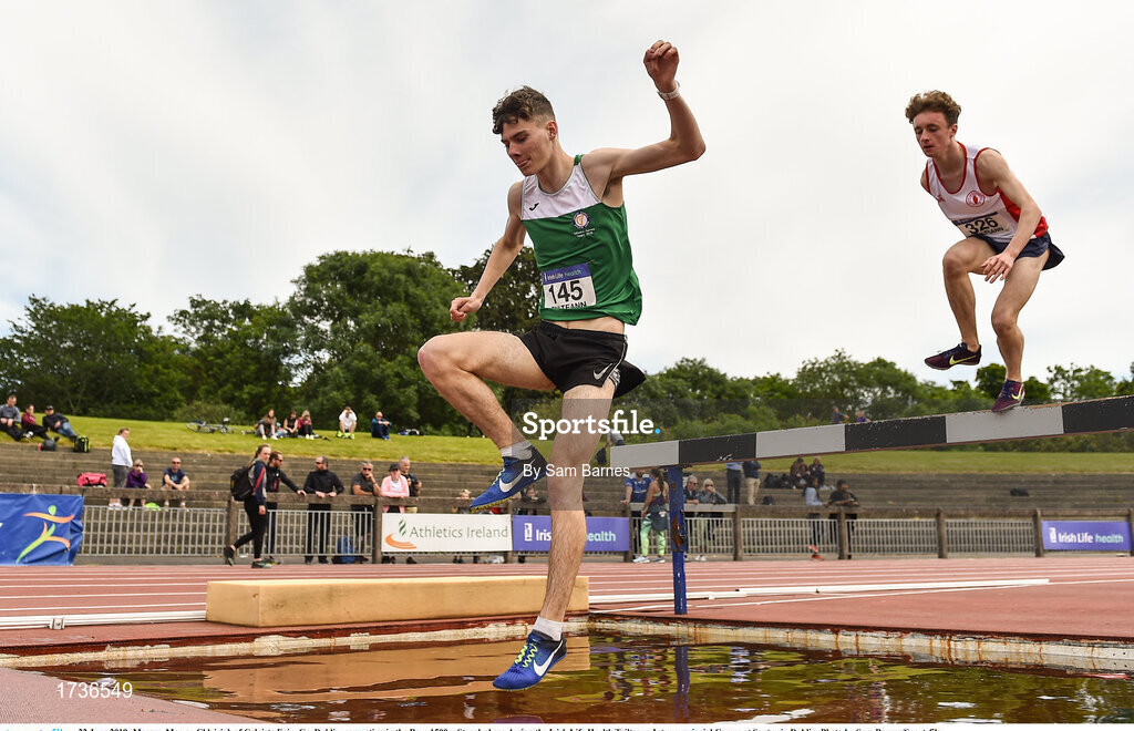 22 June 2019; Morgan Mac an Chleirigh of Colaiste Eoin, Co. Dublin, competing in the Boys 1500m Steeplechase during the Irish Life Health Tailteann Inter-provincial Games at Santry in Dublin. Photo by Sam Barnes/Sportsfile