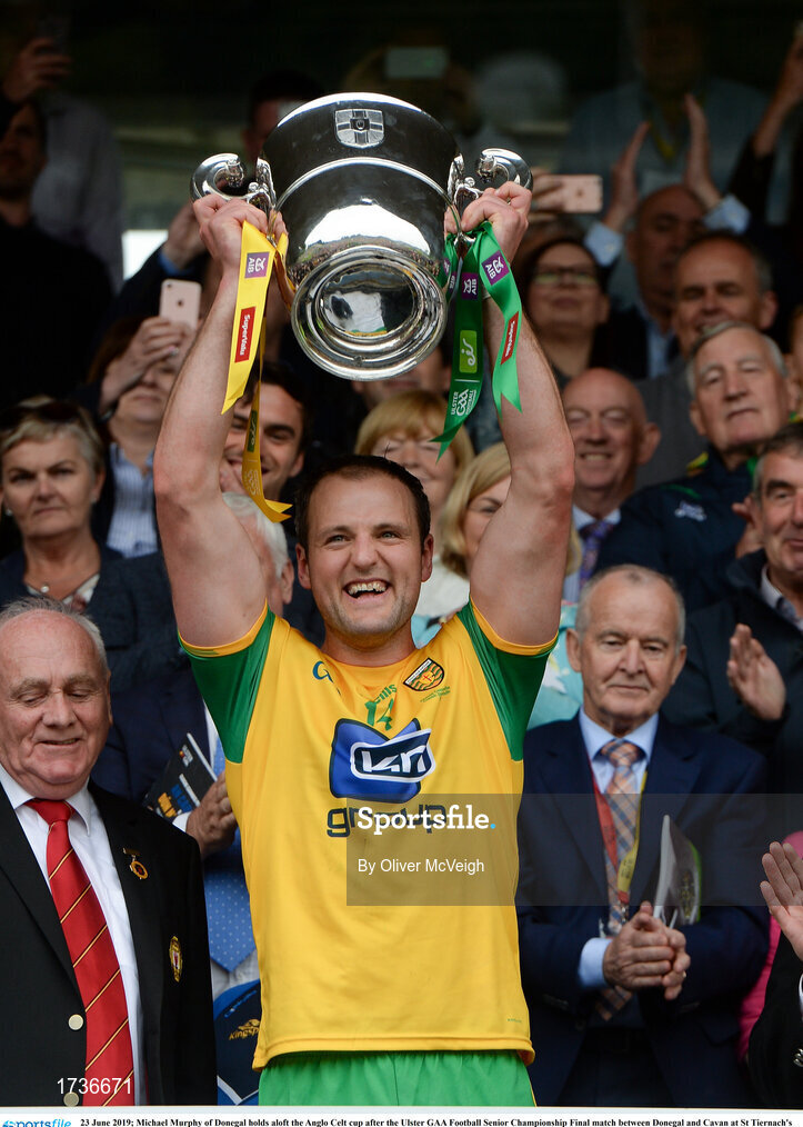 23 June 2019; Michael Murphy of Donegal holds aloft the Anglo Celt cup after the Ulster GAA Football Senior Championship Final match between Donegal and Cavan at St Tiernach's Park in Clones, Monaghan. Photo by Oliver McVeigh/Sportsfile