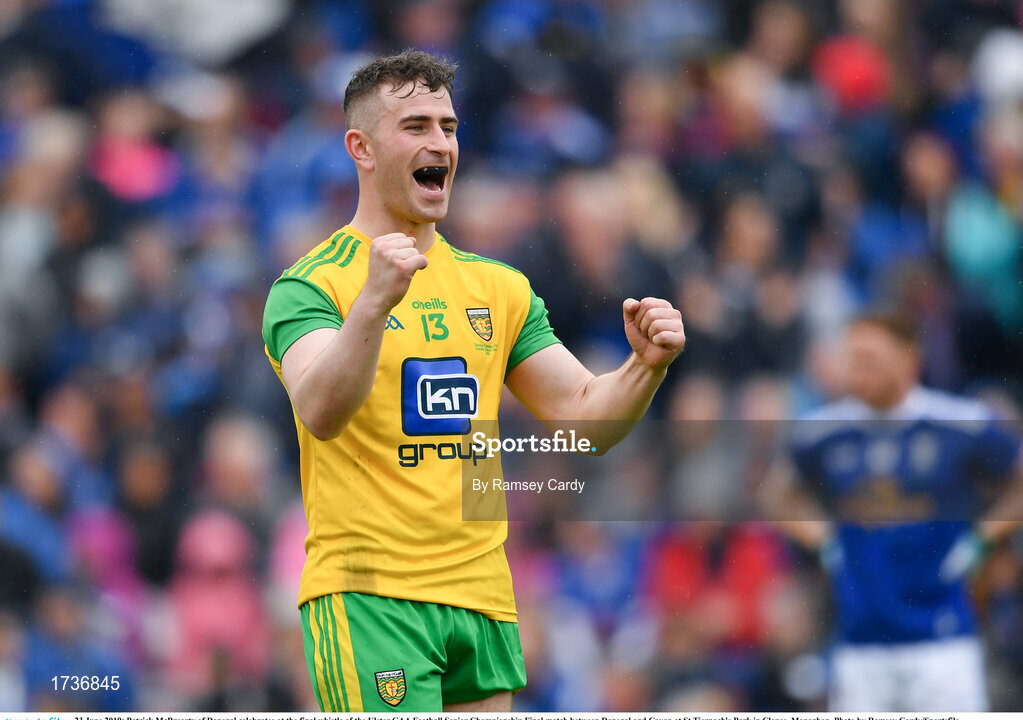 23 June 2019; Patrick McBrearty of Donegal celebrates at the final whistle of the Ulster GAA Football Senior Championship Final match between Donegal and Cavan at St Tiernach's Park in Clones, Monaghan. Photo by Ramsey Cardy/Sportsfile