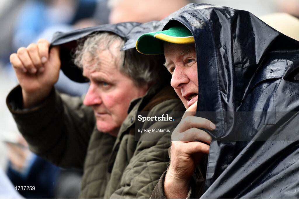 23 June 2019; Meath supporters Matt Grimes, from Dundalk, Co Louth and Noel Clarke, right, from Simonstown GAA Club, Co Meath, take shelter during the Leinster GAA Football Senior Championship Final match between Dublin and Meath at Croke Park in Dublin. Photo by Ray McManus/Sportsfile