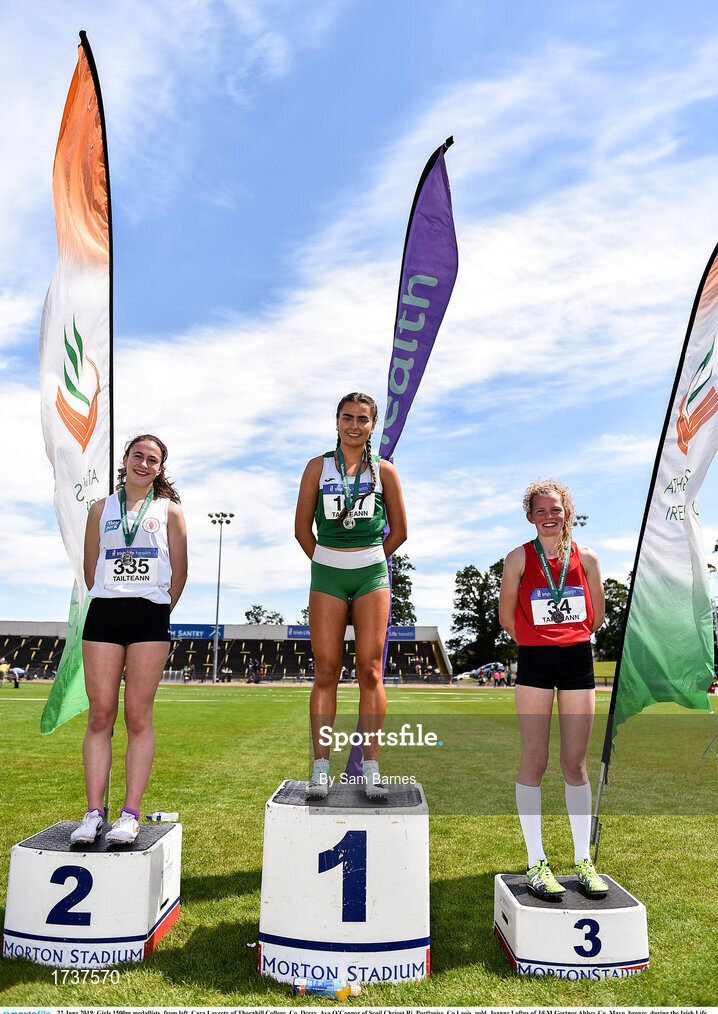 22 June 2019; Girls 1500m medallists, from left, Cara Laverty of Thornhill College, Co. Derry, Ava O’Connor of Scoil Chriost Ri, Portlaoise, Co Laois, gold, Joanne Loftus of J&M Gortnor Abbey Co. Mayo, bronze, during the Irish Life Health Tailteann Inter-provincial Games at Santry in Dublin. Photo by Sam Barnes/Sportsfile