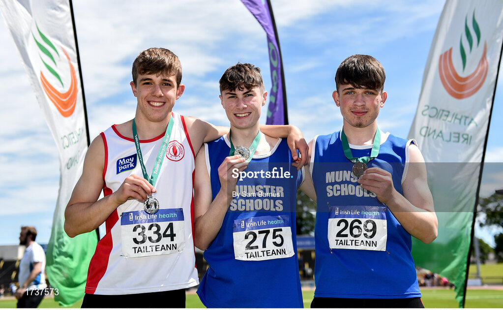 22 June 2019; Boys Triple Jump Medallists, from left, Joshua Knox of Belfast H.S, Co. Antrim, silver, Adam Turner of Colaiste Chriost Rì, Co. Cork, gold and Dillon Ryan of CBS Thurles, Co. Tipperary, bronze, during the Irish Life Health Tailteann Inter-provincial Games at Santry in Dublin. Photo by Sam Barnes/Sportsfile