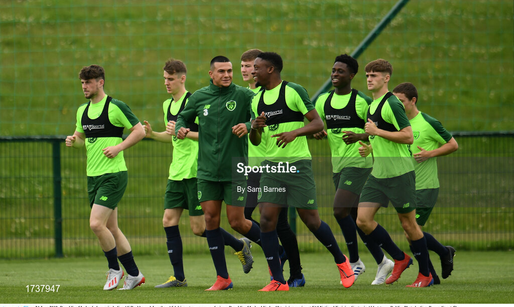 24 June 2019; Republic of Ireland players including Ali Reghba and Jonathan Afolabi, centre, warm up during a Republic of Ireland Under-19 training session at FAI National Training Centre in Abbotstown, Dublin. Photo by Sam Barnes/Sportsfile