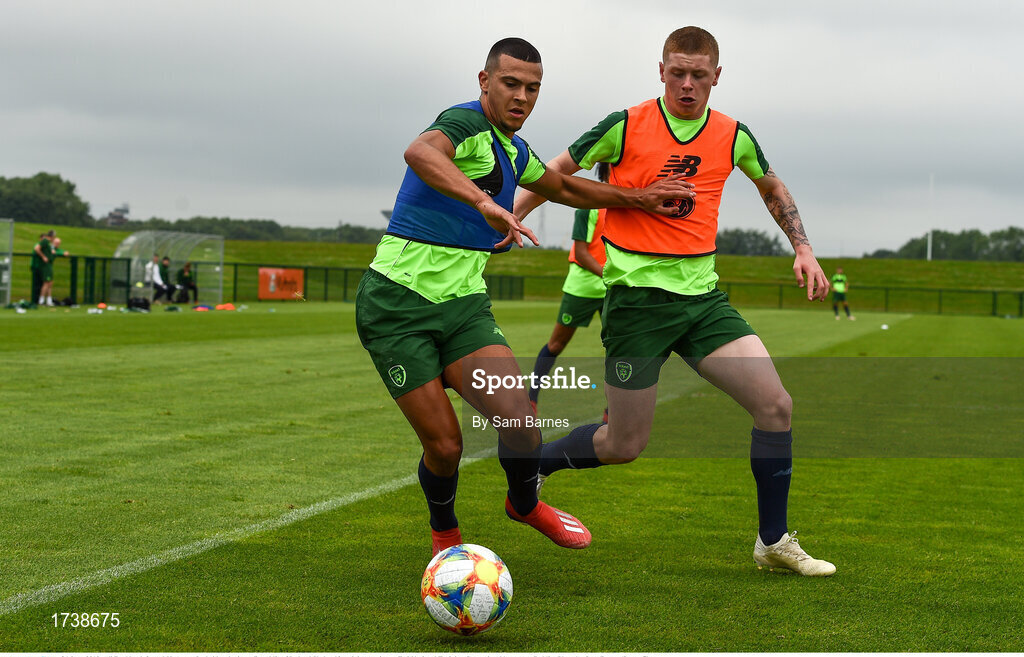 24 June 2019; Ali Reghba, left, and Kameron Ledwidge during a Republic of Ireland Under-19 training session at FAI National Training Centre in Abbotstown, Dublin. Photo by Sam Barnes/Sportsfile