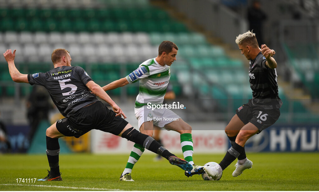 28 June 2019; Sean Kavanagh of Shamrock Rovers in action against Chris Shields, left, and Seán Murray of Dundalk during the SSE Airtricity League Premier Division match between Shamrock Rovers and Dundalk at Tallaght Stadium in Dublin. Photo by Eóin Noonan/Sportsfile