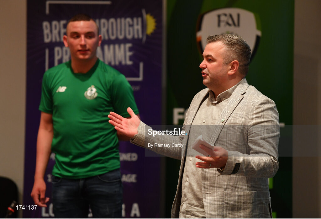 28 June 2019; Robbie De Courcy, Development Officer, FAI, and Jamie Adams, during the Breakthrough Performance Awards 2019 at the South Dublin County Council Chambers in Tallaght, Dublin. Photo by Ramsey Cardy/Sportsfile