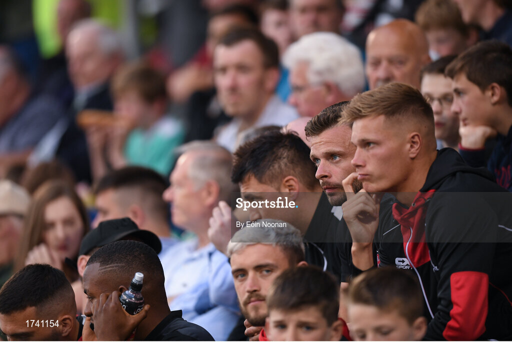 28 June 2019; Andy Boyle of Dundalk sat alongside team-mates during the SSE Airtricity League Premier Division match between Shamrock Rovers and Dundalk at Tallaght Stadium in Dublin. Photo by Eóin Noonan/Sportsfile