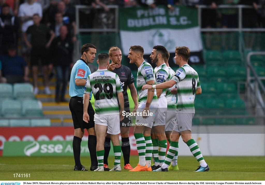 28 June 2019; Shamrock Rovers players protest to referee Robert Harvey after Gary Rogers of Dundalk fouled Trevor Clarke of Shamrock Rovers during the SSE Airtricity League Premier Division match between Shamrock Rovers and Dundalk at Tallaght Stadium in Dublin. Photo by Eóin Noonan/Sportsfile