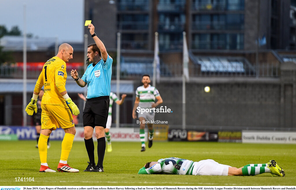 28 June 2019; Gary Rogers of Dundalk receives a yellow card from referee Robert Harvey following a foul on Trevor Clarke of Shamrock Rovers during the SSE Airtricity League Premier Division match between Shamrock Rovers and Dundalk at Tallaght Stadium in Dublin. Photo by Ben McShane/Sportsfile