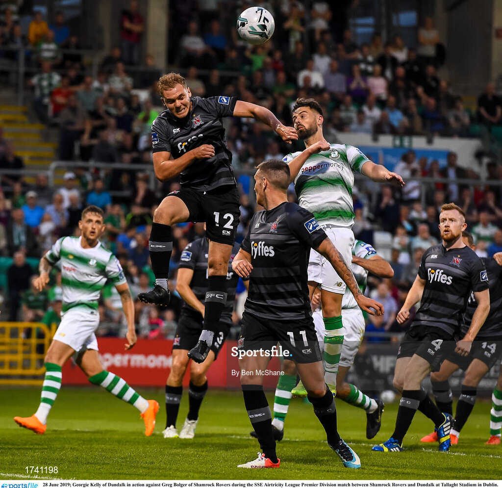 28 June 2019; Georgie Kelly of Dundalk in action against Greg Bolger of Shamrock Rovers during the SSE Airtricity League Premier Division match between Shamrock Rovers and Dundalk at Tallaght Stadium in Dublin. Photo by Ben McShane/Sportsfile
