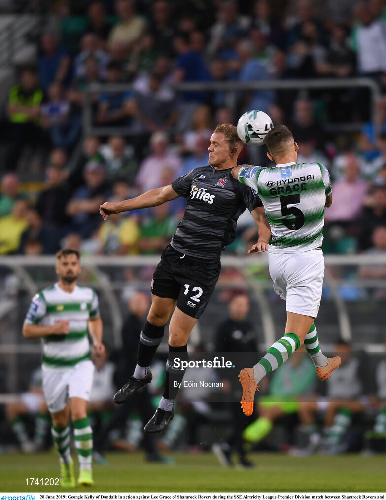 28 June 2019; Georgie Kelly of Dundalk in action against Lee Grace of Shamrock Rovers during the SSE Airtricity League Premier Division match between Shamrock Rovers and Dundalk at Tallaght Stadium in Dublin. Photo by Eóin Noonan/Sportsfile