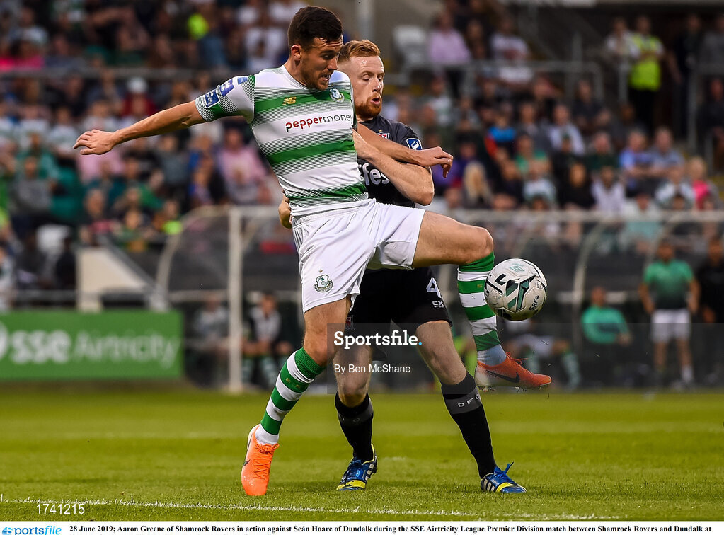 28 June 2019; Aaron Greene of Shamrock Rovers in action against Seán Hoare of Dundalk during the SSE Airtricity League Premier Division match between Shamrock Rovers and Dundalk at Tallaght Stadium in Dublin. Photo by Ben McShane/Sportsfile