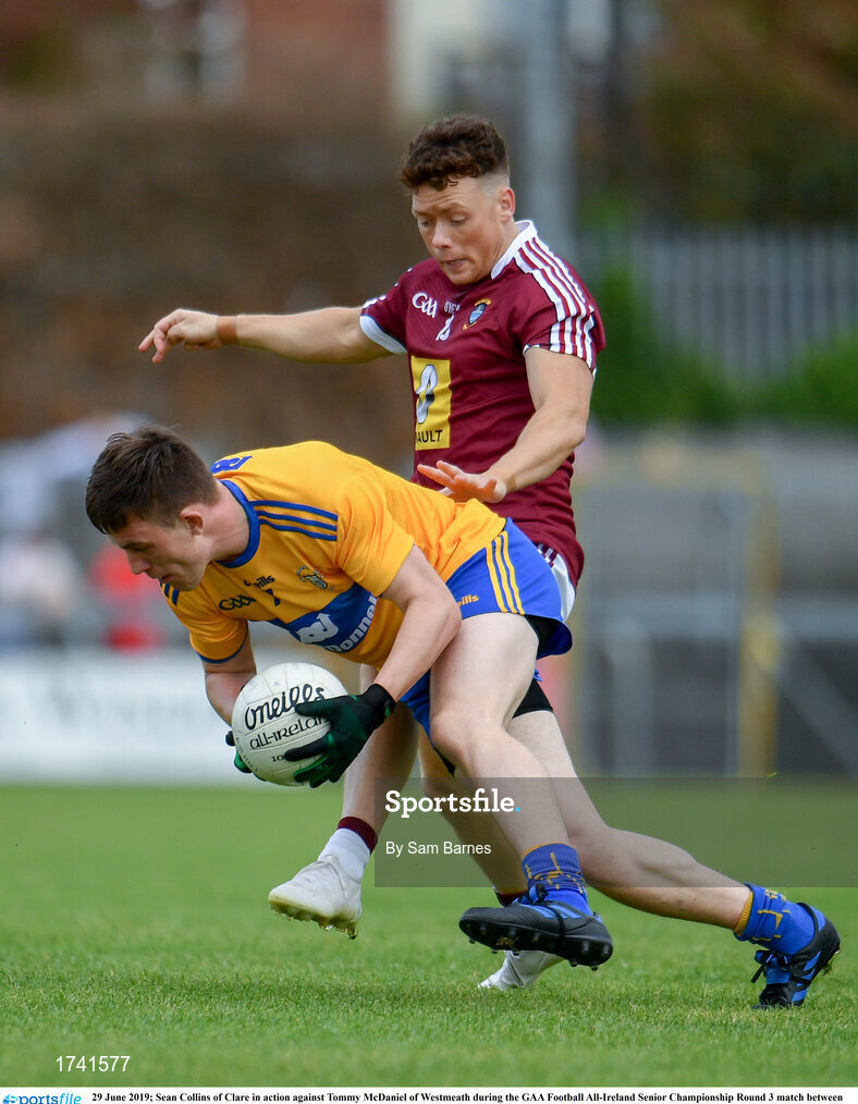 29 June 2019; Sean Collins of Clare in action against Tommy McDaniel of Westmeath during the GAA Football All-Ireland Senior Championship Round 3 match between Westmeath and Clare at TEG Cusack Park in Mullingar, Westmeath. Photo by Sam Barnes/Sportsfile