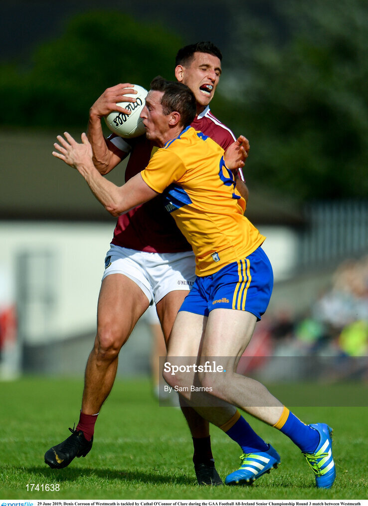 29 June 2019; Denis Corroon of Westmeath is tackled by Cathal O'Connor of Clare during the GAA Football All-Ireland Senior Championship Round 3 match between Westmeath and Clare at TEG Cusack Park in Mullingar, Westmeath. Photo by Sam Barnes/Sportsfile