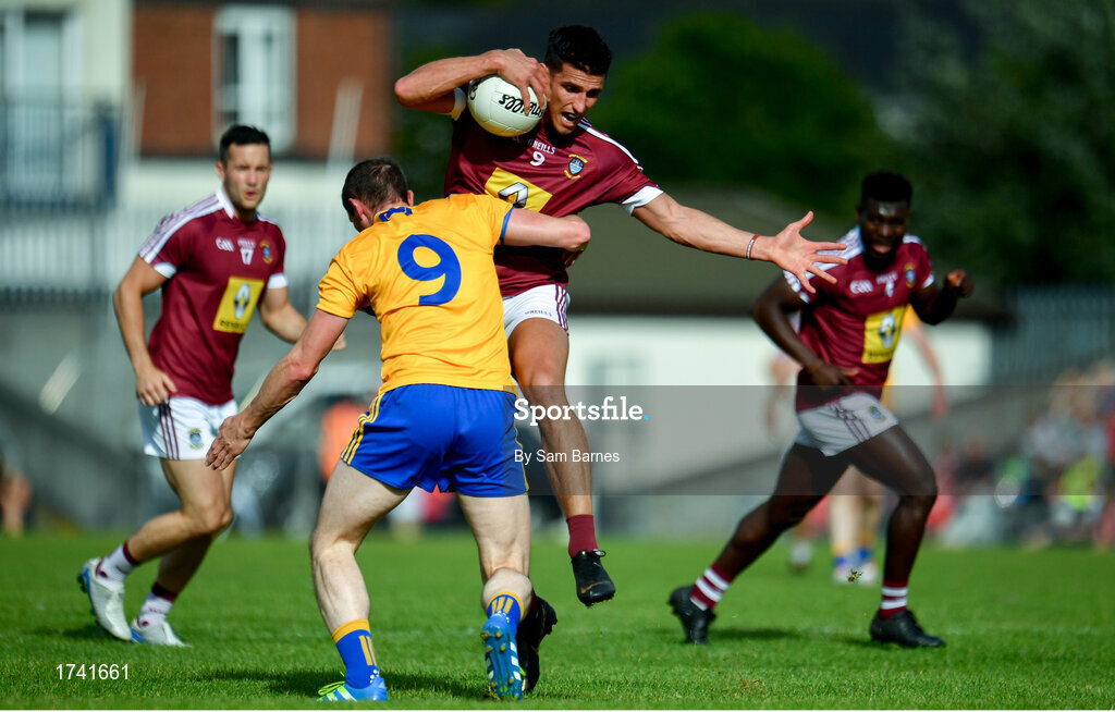 29 June 2019; Denis Corroon of Westmeath is tackled by Cathal O'Connor of Clare during the GAA Football All-Ireland Senior Championship Round 3 match between Westmeath and Clare at TEG Cusack Park in Mullingar, Westmeath. Photo by Sam Barnes/Sportsfile