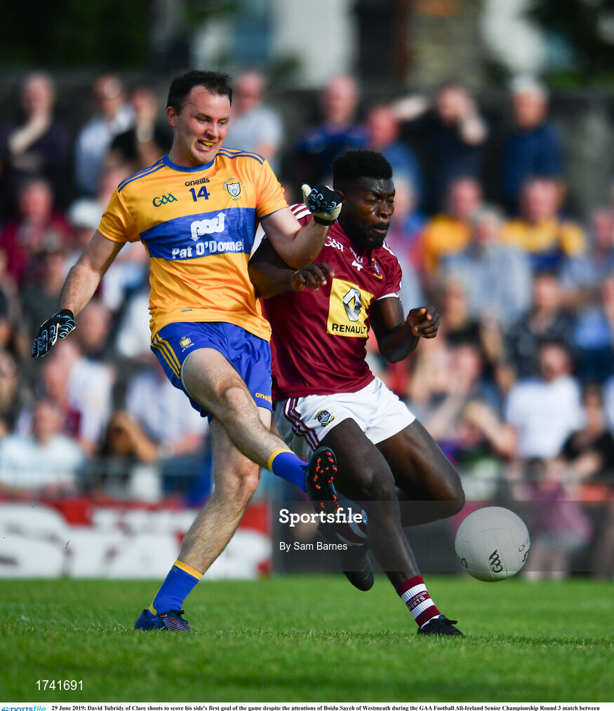 29 June 2019; David Tubridy of Clare shoots to score his side's first goal of the game despite the attentions of Boidu Sayeh of Westmeath during the GAA Football All-Ireland Senior Championship Round 3 match between Westmeath and Clare at TEG Cusack Park in Mullingar, Westmeath. Photo by Sam Barnes/Sportsfile