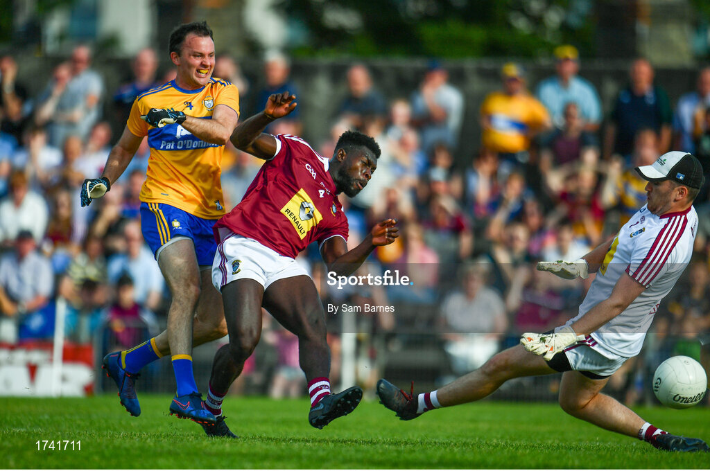 29 June 2019; David Tubridy of Clare shoots to score his side's first goal of the game despite the attentions of Boidu Sayeh, left, and Eoin Carberry of Westmeath during the GAA Football All-Ireland Senior Championship Round 3 match between Westmeath and Clare at TEG Cusack Park in Mullingar, Westmeath. Photo by Sam Barnes/Sportsfile