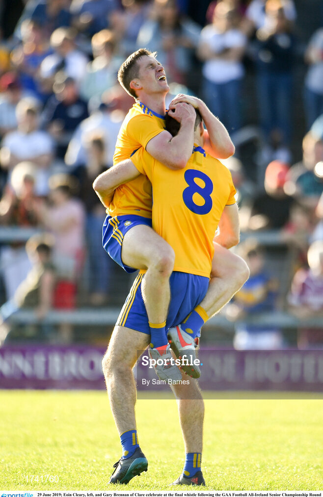 29 June 2019; Eoin Cleary, left, and Gary Brennan of Clare celebrate at the final whistle following the GAA Football All-Ireland Senior Championship Round 3 match between Westmeath and Clare at TEG Cusack Park in Mullingar, Westmeath. Photo by Sam Barnes/Sportsfile