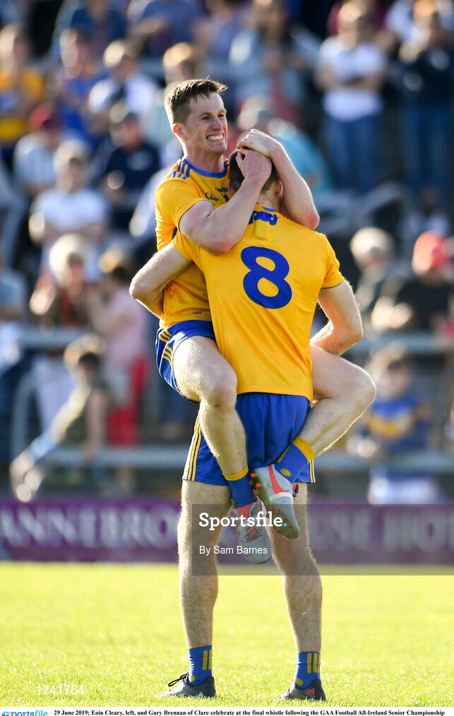 29 June 2019; Eoin Cleary, left, and Gary Brennan of Clare celebrate at the final whistle following the GAA Football All-Ireland Senior Championship Round 3 match between Westmeath and Clare at TEG Cusack Park in Mullingar, Westmeath. Photo by Sam Barnes/Sportsfile