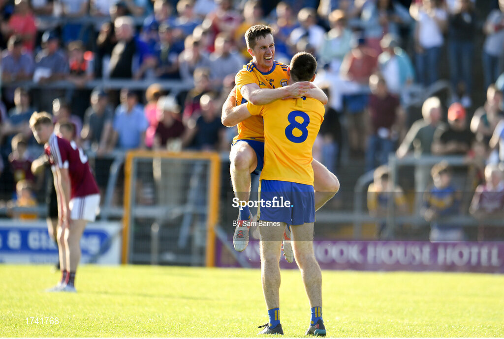 29 June 2019; Eoin Cleary, left, and Gary Brennan of Clare celebrate at the final whistle following the GAA Football All-Ireland Senior Championship Round 3 match between Westmeath and Clare at TEG Cusack Park in Mullingar, Westmeath. Photo by Sam Barnes/Sportsfile
