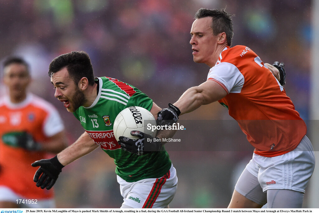 29 June 2019; Kevin McLoughlin of Mayo is pushed Mark Shields of Armagh, resulting in a foul, during the GAA Football All-Ireland Senior Championship Round 3 match between Mayo and Armagh at Elverys MacHale Park in Castlebar, Mayo. Photo by Ben McShane/Sportsfile
