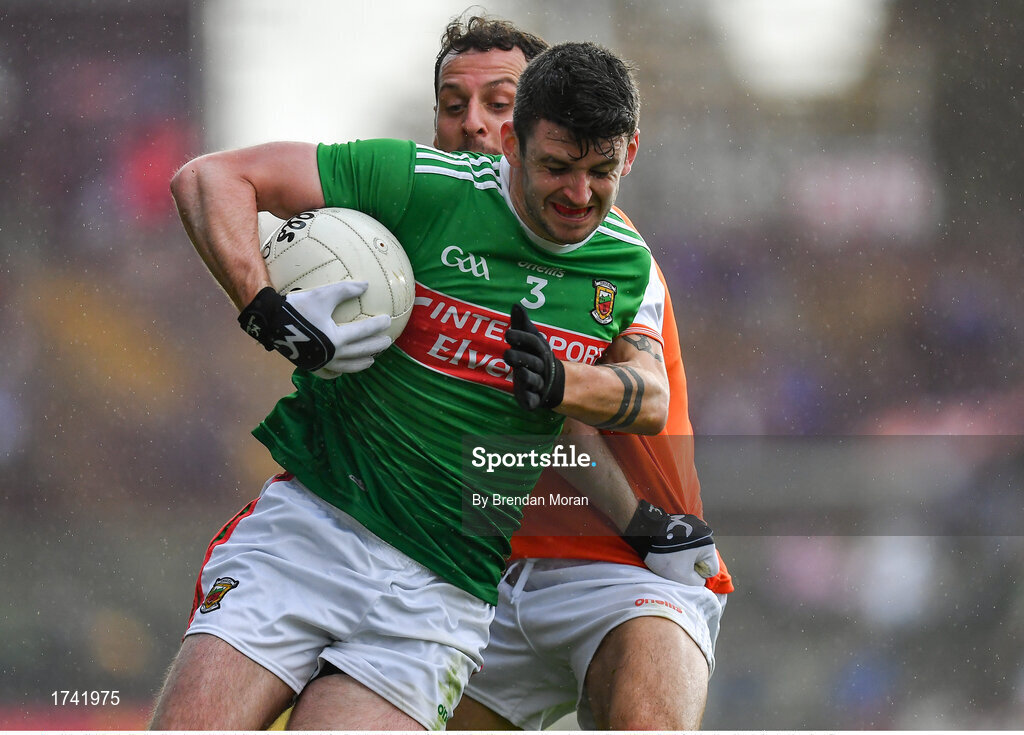 29 June 2019; Brendan Harrison of Mayo is tackled by Jamie Clarke of Armagh during the GAA Football All-Ireland Senior Championship Round 3 match between Mayo and Armagh at Elverys MacHale Park in Castlebar, Mayo. Photo by Brendan Moran/Sportsfile