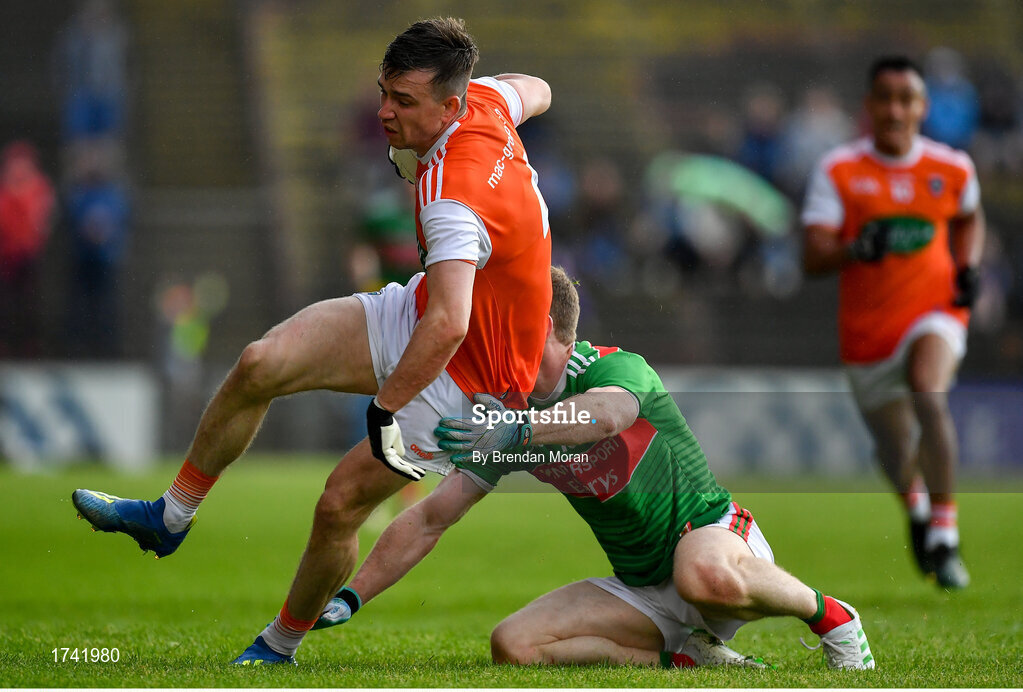 29 June 2019; Paul Hughes of Armagh is tackled by Colm Boyle of Mayo during the GAA Football All-Ireland Senior Championship Round 3 match between Mayo and Armagh at Elverys MacHale Park in Castlebar, Mayo. Photo by Brendan Moran/Sportsfile
