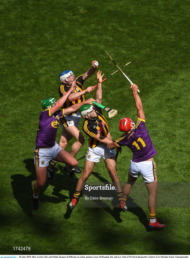 30 June 2019; Huw Lawlor, left, and Paddy Deegan of Kilkenny in action against Conor McDonald, left, and Lee Chin of Wexford during the Leinster GAA Hurling Senior Championship Final match between Kilkenny and Wexford at Croke Park in Dublin. Photo by Daire Brennan/Sportsfile