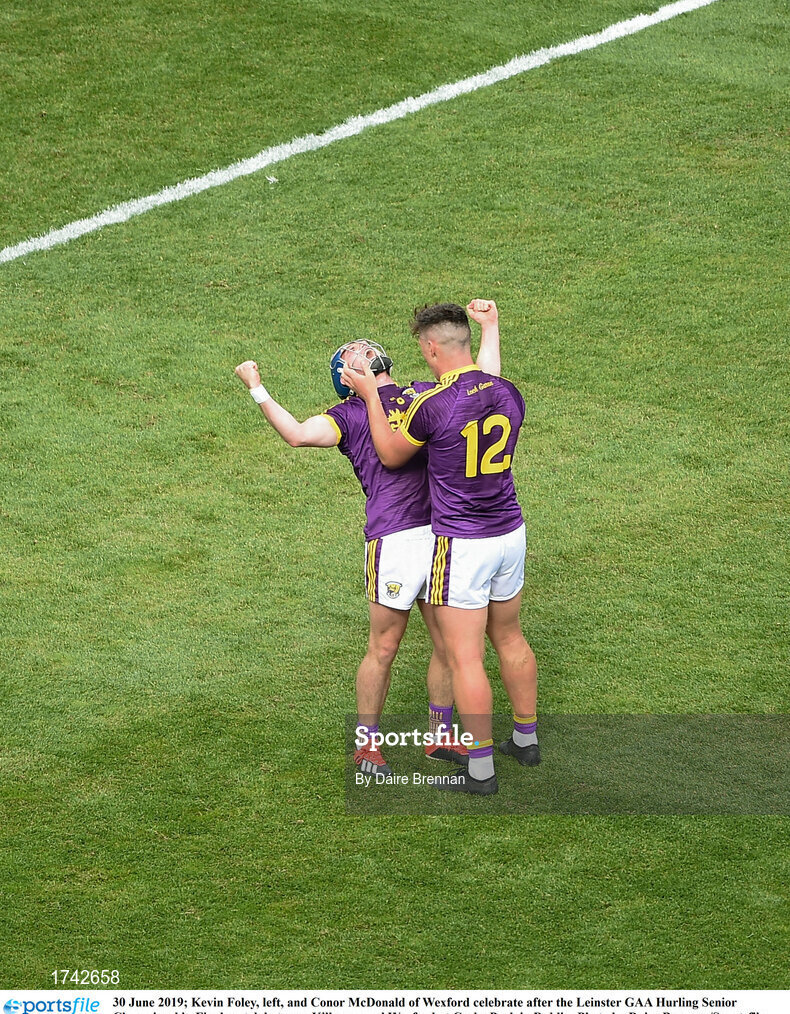 30 June 2019; Kevin Foley, left, and Conor McDonald of Wexford celebrate after the Leinster GAA Hurling Senior Championship Final match between Kilkenny and Wexford at Croke Park in Dublin. Photo by Daire Brennan/Sportsfile