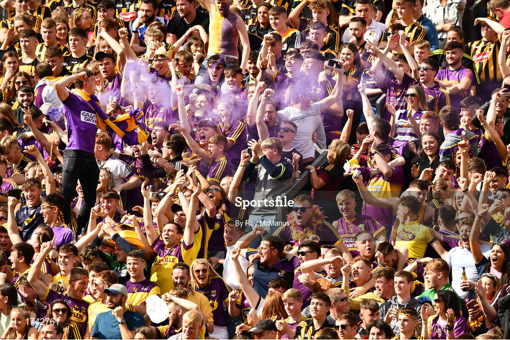 30 June 2019; Wexford supporters, on Hill 16, celebrate after their side had scored a penalty during the Leinster GAA Hurling Senior Championship Final match between Kilkenny and Wexford at Croke Park in Dublin. Photo by Ray McManus/Sportsfile