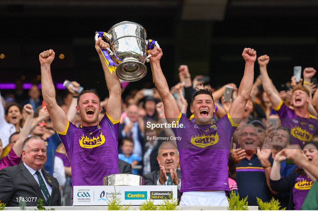 30 June 2019; Wexford joint-captains Matthew O'Hanlon and Lee Chin lift the cup following the Leinster GAA Hurling Senior Championship Final match between Kilkenny and Wexford at Croke Park in Dublin. Photo by Ramsey Cardy/Sportsfile