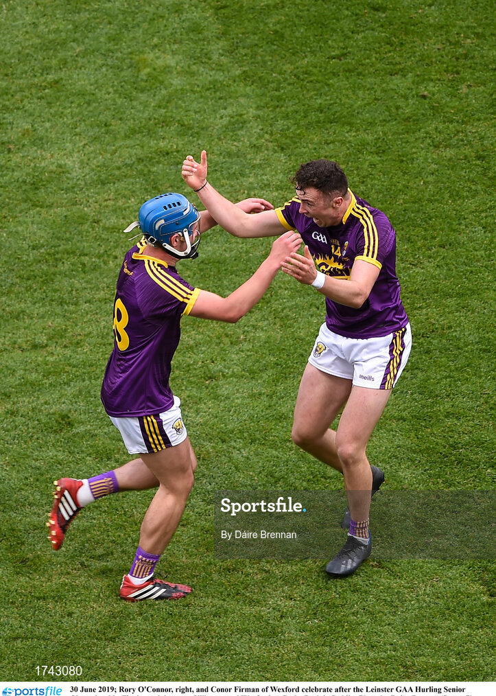 30 June 2019; Rory O'Connor, right, and Conor Firman of Wexford celebrate after the Leinster GAA Hurling Senior Championship Final match between Kilkenny and Wexford at Croke Park in Dublin. Photo by Daire Brennan/Sportsfile