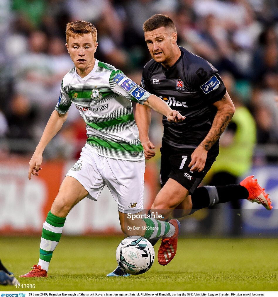 28 June 2019; Brandon Kavanagh of Shamrock Rovers in action against Patrick McEleney of Dundalk during the SSE Airtricity League Premier Division match between Shamrock Rovers and Dundalk at Tallaght Stadium in Dublin. Photo by Ben McShane/Sportsfile