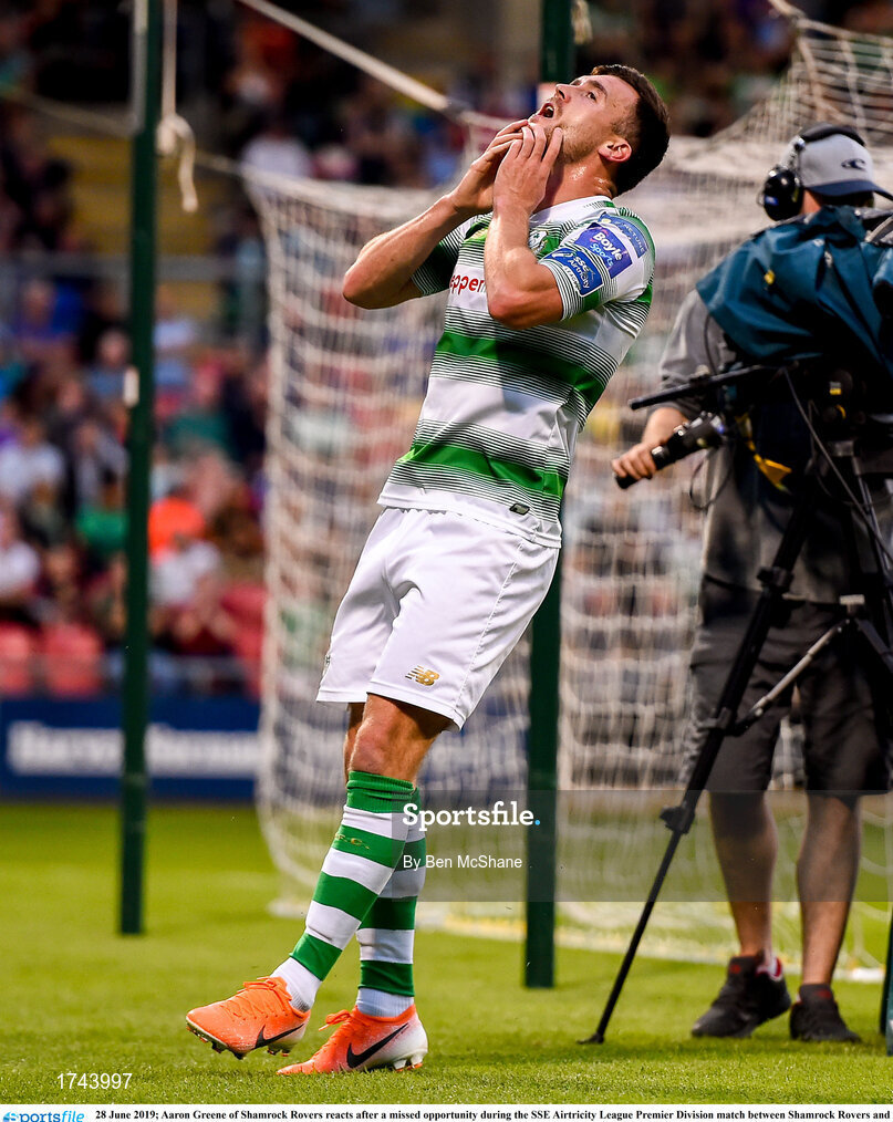 28 June 2019; Aaron Greene of Shamrock Rovers reacts after a missed opportunity during the SSE Airtricity League Premier Division match between Shamrock Rovers and Dundalk at Tallaght Stadium in Dublin. Photo by Ben McShane/Sportsfile
