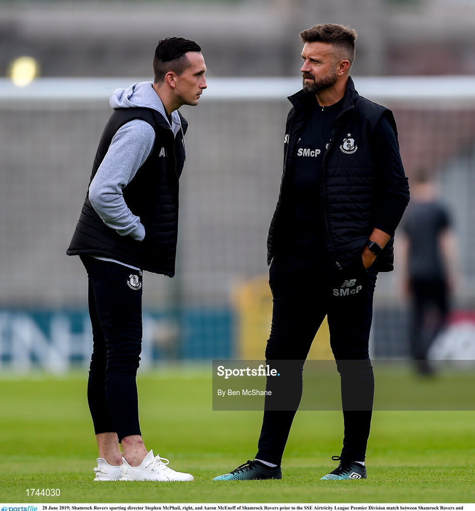 28 June 2019; Shamrock Rovers sporting director Stephen McPhail, right, and Aaron McEneff of Shamrock Rovers prior to the SSE Airtricity League Premier Division match between Shamrock Rovers and Dundalk at Tallaght Stadium in Dublin. Photo by Ben McShane/Sportsfile