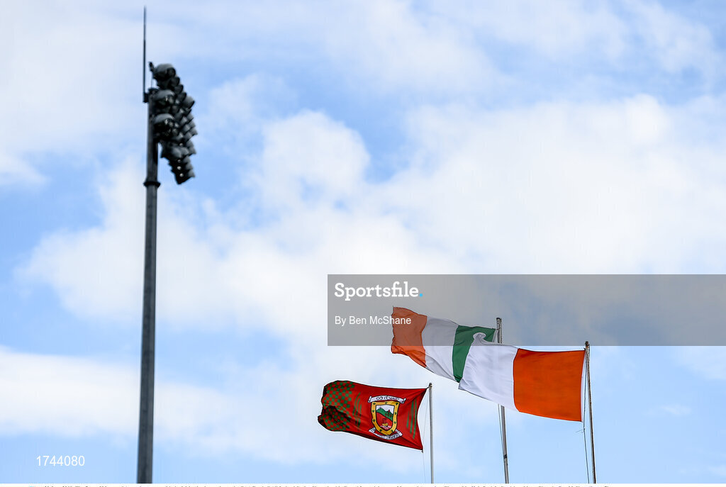 29 June 2019; The flags of Mayo and Armagh are seen with the Irish tri-colour prior to the GAA Football All-Ireland Senior Championship Round 3 match between Mayo and Armagh at Elverys MacHale Park in Castlebar, Mayo. Photo by Ben McShane/Sportsfile