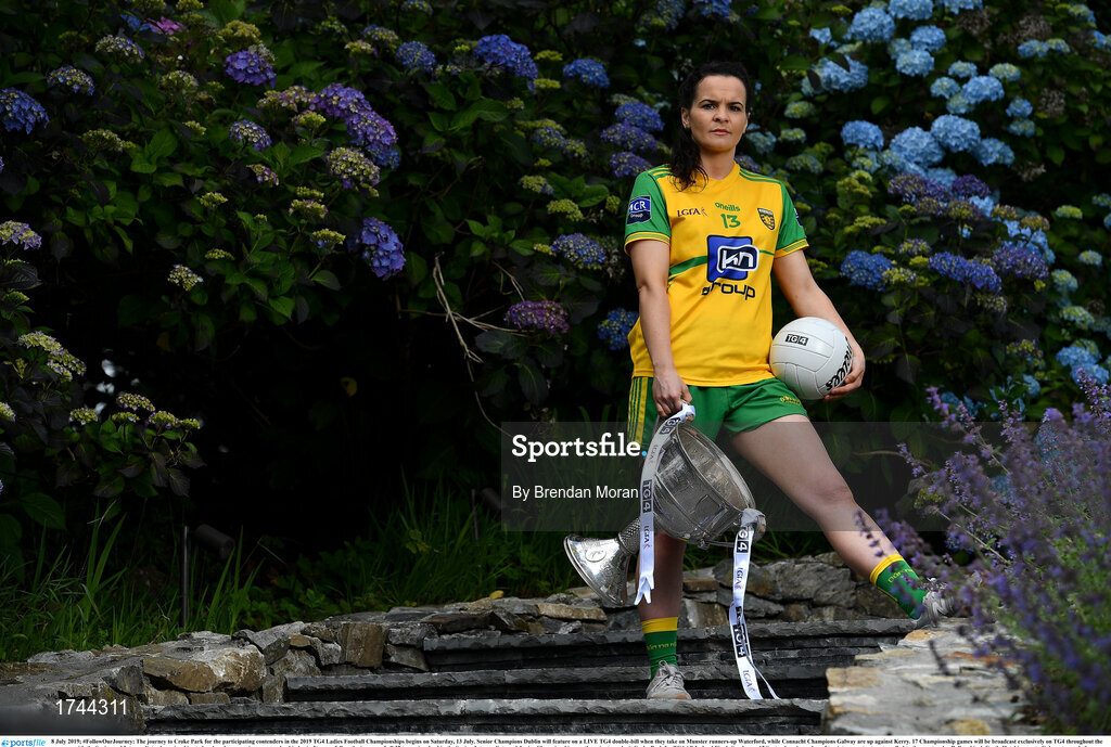 8 July 2019; #FollowOurJourney: The journey to Croke Park for the participating contenders in the 2019 TG4 Ladies Football Championships begins on Saturday, 13 July. Senior Champions Dublin will feature on a LIVE TG4 double-bill when they take on Munster runners-up Waterford, while Connacht Champions Galway are up against Kerry. 17 Championship games will be broadcast exclusively on TG4 throughout the summer, with the Senior and Intermediate championships to be played once again on a round-robin basis. You can follow the journey of all 32 teams involved in the Senior, Intermediate and Junior Championships, as they aim to make it Croke Park for TG4 All-Ireland Finals Sunday on 15 September. A number of top inter-county stars travelled to the spectacular Ballynahinch Castle Hotel in county Galway to mark the beginning of the TG4 All-Ireland series. Pictured is Geraldine McLaughlin of Donegal with the Brendan Martin Cup. #ProperFan. Photo by Brendan Moran/Sportsfile