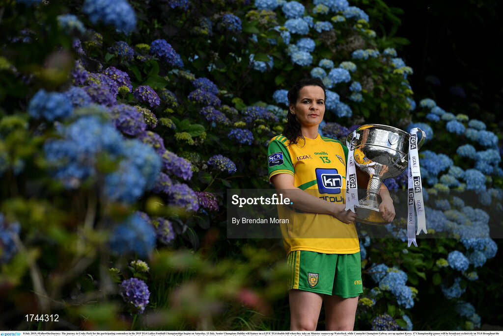8 July 2019; #FollowOurJourney: The journey to Croke Park for the participating contenders in the 2019 TG4 Ladies Football Championships begins on Saturday, 13 July. Senior Champions Dublin will feature on a LIVE TG4 double-bill when they take on Munster runners-up Waterford, while Connacht Champions Galway are up against Kerry. 17 Championship games will be broadcast exclusively on TG4 throughout the summer, with the Senior and Intermediate championships to be played once again on a round-robin basis. You can follow the journey of all 32 teams involved in the Senior, Intermediate and Junior Championships, as they aim to make it Croke Park for TG4 All-Ireland Finals Sunday on 15 September. A number of top inter-county stars travelled to the spectacular Ballynahinch Castle Hotel in county Galway to mark the beginning of the TG4 All-Ireland series. Pictured is Geraldine McLaughlin of Donegal with the Brendan Martin Cup. #ProperFan. Photo by Brendan Moran/Sportsfile
