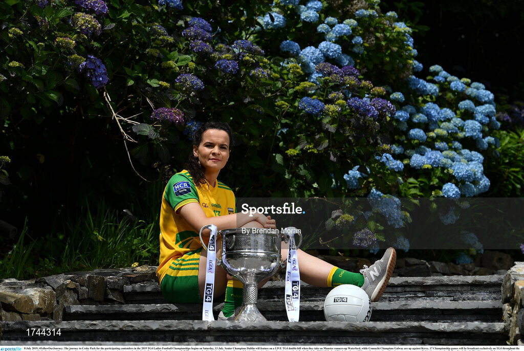 8 July 2019; #FollowOurJourney: The journey to Croke Park for the participating contenders in the 2019 TG4 Ladies Football Championships begins on Saturday, 13 July. Senior Champions Dublin will feature on a LIVE TG4 double-bill when they take on Munster runners-up Waterford, while Connacht Champions Galway are up against Kerry. 17 Championship games will be broadcast exclusively on TG4 throughout the summer, with the Senior and Intermediate championships to be played once again on a round-robin basis. You can follow the journey of all 32 teams involved in the Senior, Intermediate and Junior Championships, as they aim to make it Croke Park for TG4 All-Ireland Finals Sunday on 15 September. A number of top inter-county stars travelled to the spectacular Ballynahinch Castle Hotel in county Galway to mark the beginning of the TG4 All-Ireland series. Pictured is Geraldine McLaughlin of Donegal with the Brendan Martin Cup. #ProperFan. Photo by Brendan Moran/Sportsfile