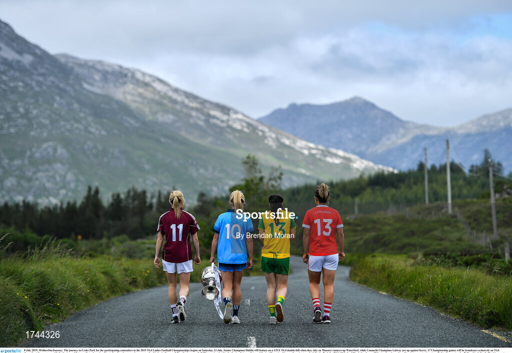 8 July 2019; #FollowOurJourney: The journey to Croke Park for the participating contenders in the 2019 TG4 Ladies Football Championships begins on Saturday, 13 July. Senior Champions Dublin will feature on a LIVE TG4 double-bill when they take on Munster runners-up Waterford, while Connacht Champions Galway are up against Kerry. 17 Championship games will be broadcast exclusively on TG4 throughout the summer, with the Senior and Intermediate championships to be played once again on a round-robin basis. You can follow the journey of all 32 teams involved in the Senior, Intermediate and Junior Championships, as they aim to make it Croke Park for TG4 All-Ireland Finals Sunday on 15 September. A number of top inter-county stars travelled to the spectacular Ballynahinch Castle Hotel in county Galway to mark the beginning of the TG4 All-Ireland series. Pictured are, from left, Tracey Leonard of Galway, Carla Rowe of Dublin, Geraldine McLaughlin of Donegal and Doireann OSullivan of Cork with the Brendan Martin Cup. #ProperFan. Photo by Brendan Moran/Sportsfile