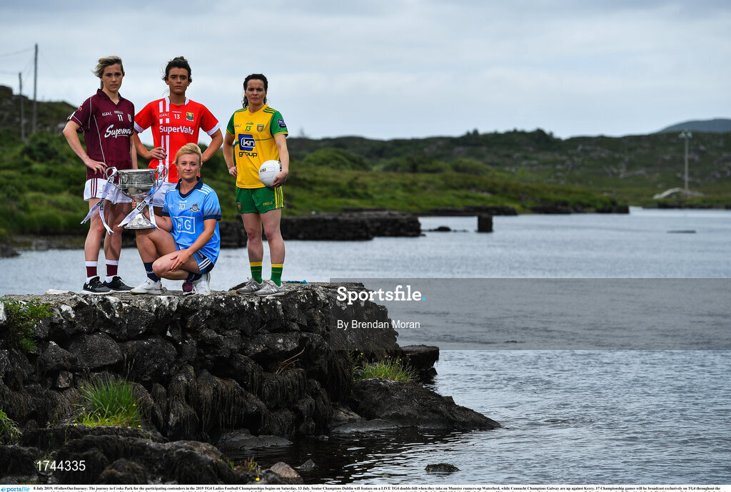 8 July 2019; #FollowOurJourney: The journey to Croke Park for the participating contenders in the 2019 TG4 Ladies Football Championships begins on Saturday, 13 July. Senior Champions Dublin will feature on a LIVE TG4 double-bill when they take on Munster runners-up Waterford, while Connacht Champions Galway are up against Kerry. 17 Championship games will be broadcast exclusively on TG4 throughout the summer, with the Senior and Intermediate championships to be played once again on a round-robin basis. You can follow the journey of all 32 teams involved in the Senior, Intermediate and Junior Championships, as they aim to make it Croke Park for TG4 All-Ireland Finals Sunday on 15 September. A number of top inter-county stars travelled to the spectacular Ballynahinch Castle Hotel in county Galway to mark the beginning of the TG4 All-Ireland series. Pictured are, from left, Tracey Leonard of Galway, Doireann O'Sullivan of Cork, Carla Rowe of Dublin, and Geraldine McLaughlin of Donegal with the Brendan Martin Cup. #ProperFan. Photo by Brendan Moran/Sportsfile