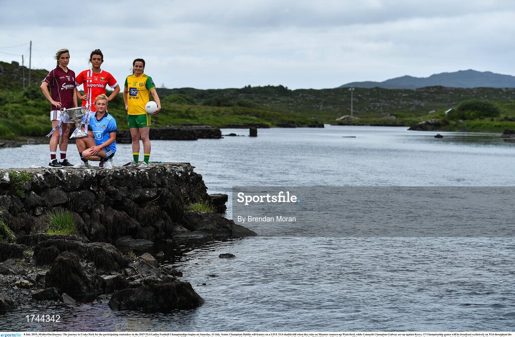 8 July 2019; #FollowOurJourney: The journey to Croke Park for the participating contenders in the 2019 TG4 Ladies Football Championships begins on Saturday, 13 July. Senior Champions Dublin will feature on a LIVE TG4 double-bill when they take on Munster runners-up Waterford, while Connacht Champions Galway are up against Kerry. 17 Championship games will be broadcast exclusively on TG4 throughout the summer, with the Senior and Intermediate championships to be played once again on a round-robin basis. You can follow the journey of all 32 teams involved in the Senior, Intermediate and Junior Championships, as they aim to make it Croke Park for TG4 All-Ireland Finals Sunday on 15 September. A number of top inter-county stars travelled to the spectacular Ballynahinch Castle Hotel in county Galway to mark the beginning of the TG4 All-Ireland series. Pictured are, from left, Tracey Leonard of Galway, Doireann O'Sullivan of Cork, Carla Rowe of Dublin, and Geraldine McLaughlin of Donegal with the Brendan Martin Cup. #ProperFan. Photo by Brendan Moran/Sportsfile
