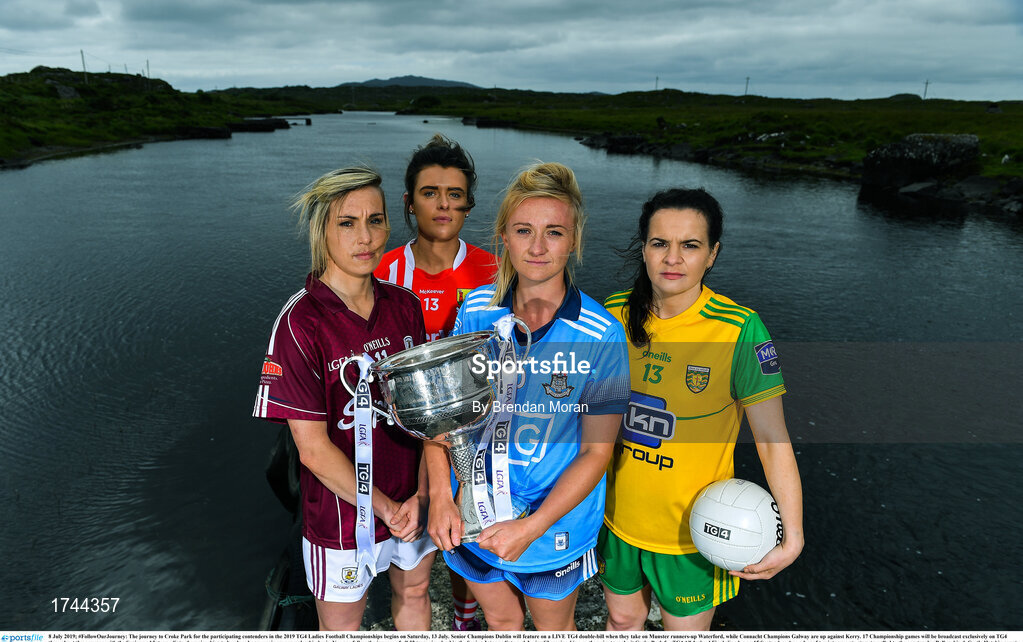 8 July 2019; #FollowOurJourney: The journey to Croke Park for the participating contenders in the 2019 TG4 Ladies Football Championships begins on Saturday, 13 July. Senior Champions Dublin will feature on a LIVE TG4 double-bill when they take on Munster runners-up Waterford, while Connacht Champions Galway are up against Kerry. 17 Championship games will be broadcast exclusively on TG4 throughout the summer, with the Senior and Intermediate championships to be played once again on a round-robin basis. You can follow the journey of all 32 teams involved in the Senior, Intermediate and Junior Championships, as they aim to make it Croke Park for TG4 All-Ireland Finals Sunday on 15 September. A number of top inter-county stars travelled to the spectacular Ballynahinch Castle Hotel in county Galway to mark the beginning of the TG4 All-Ireland series. Pictured are, from left, Tracey Leonard of Galway, Doireann O'Sullivan of Cork, Carla Rowe of Dublin, and Geraldine McLaughlin of Donegal with the Brendan Martin Cup. #ProperFan. Photo by Brendan Moran/Sportsfile