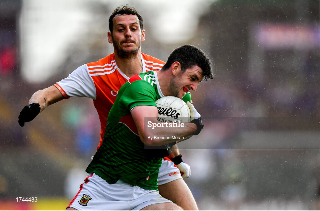 29 June 2019; Brendan Harrison of Mayo is tackled by Jamie Clarke of Armagh during the GAA Football All-Ireland Senior Championship Round 3 match between Mayo and Armagh at Elverys MacHale Park in Castlebar, Mayo. Photo by Brendan Moran/Sportsfile