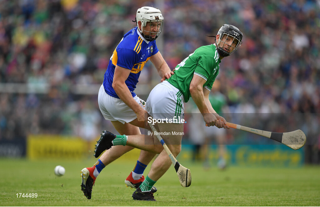 30 June 2019; Brendan Maher of Tipperary and Graeme Mulcahy of Limerick contest a loose ball during the Munster GAA Hurling Senior Championship Final match between Limerick and Tipperary at LIT Gaelic Grounds in Limerick. Photo by Brendan Moran/Sportsfile