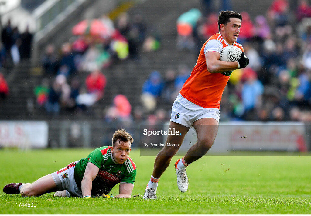 29 June 2019; Stefan Campbell of Armagh in action against Donal Vaughan of Mayo during the GAA Football All-Ireland Senior Championship Round 3 match between Mayo and Armagh at Elverys MacHale Park in Castlebar, Mayo. Photo by Brendan Moran/Sportsfile